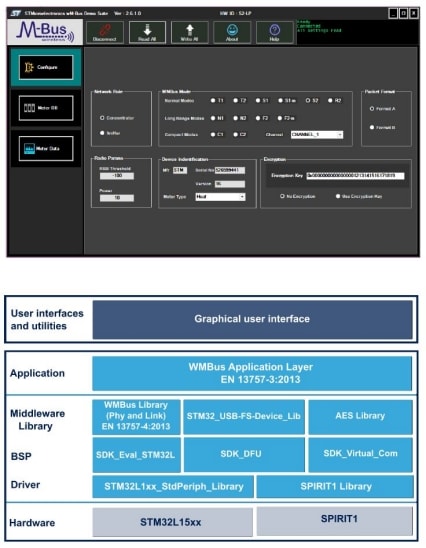 The STSW-WMBUS-GUI (wM-Bus demo suite) is a PC application to easily evaluate the features of the wM-Bus firmware running on ST Sub-1GHz devices.