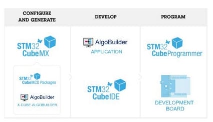 The X-CUBE-ALGOBUILD is an STM32CubeMX plugin which allows the user to select STM32 microcontrollers, specific MEMS sensors and STM32 Nucleo expansion boards, configure the necessary peripherals and then generate firmware templates for the AlgoBuilder application. The firmware templates can be generated for all the supported IDEs.