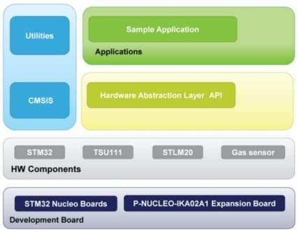 The X-CUBE-IKA02A1 expansion software package for STM32Cube runs on the STM32 microcontrollers to read the analog value of gas concentration, reference voltage and the temperature from the STLM20 temperature sensor.