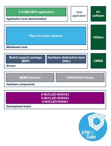 このSTM32Cube向けのX-CUBE-ISPU拡張ソフトウェア・パッケージは、STM32上で動作します。センサを認識し、温度、湿度、圧力、モーション、およびISPUのデータを収集するドライバを備えています。