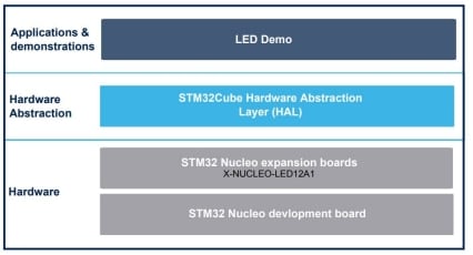 The X-CUBE-LED12A1 expansion software package for STM32Cube runs on the STM32 and includes drivers that recognize the LED1202 LED Driver IC.