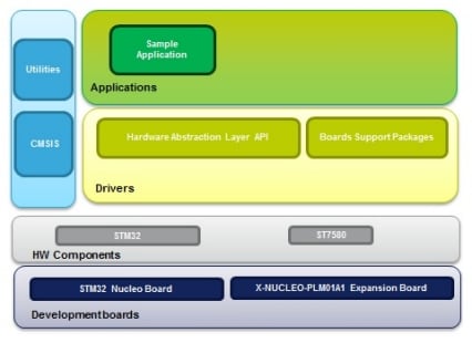 - Sample implementation available on XNUCLEO- PLM01A1 board connected to a NUCLEO-F401RE or NUCLEO-L053R8 development board