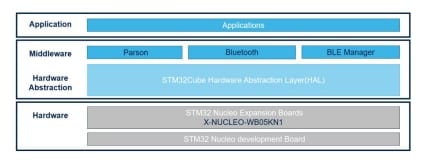 The X-CUBE-WB05N expansion software package for STM32Cube runs on the STM32 and includes drivers for STM32WB05xN Bluetooth® low energy device.