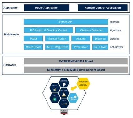The X-LINUX-RBT1 provides drivers, APIs, and applications for the X-STM32MP-RBT01 board, which features the STSPIN948 motor driver and various sensors like: ISM330DHCX IMU, IIS2MDC magnetometer sensor, LPS22HH pressure sensor, VL53L5CX ToF sensor.