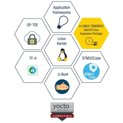 The X-LINUX-TSNSWCH Expansion Package is a Yocto layer. It provides the necessary material to generate software for managing TSN and the hardware Ethernet switch at the userland and Linux® kernel levels. It eases development for a user wanting to achieve one of the following goals: