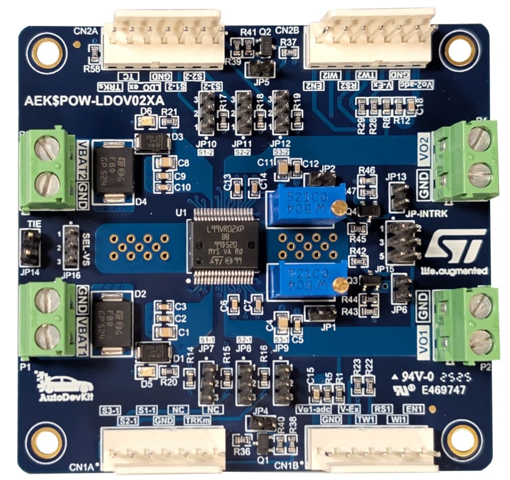 The AEK-POW-LDOV02X is an evaluation board based on the L99VR02XP dual automotive-grade linear voltage regulator.