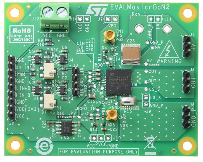 The EVALMASTERGAN2 board is an easy to use and quick to adapt tool to evaluate the characteristics of MASTERGAN2 and to quickly create new topologies without the need of complete PCB design.