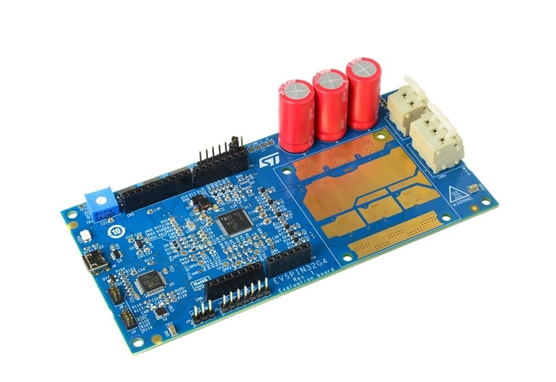 The EVSPIN32G4 is a demonstration board based on the STSPIN32G4 system in package and STL110N10F7 power MOSFETs. The STSPIN32G4 integrates in a 9x9 mm VFQFPN package, a triple high-performance half-bridge gate driver with a rich set of programmable features and one mixed signal STM32G431 microcontroller.