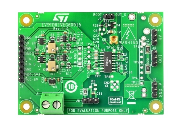 The EVSTDRIVEG60015 board is easy to use and quick and adapt for evaluating the characteristics of STDRIVEG600 driving 75 mΩ typ., 650 V E-Mode GaN switches.