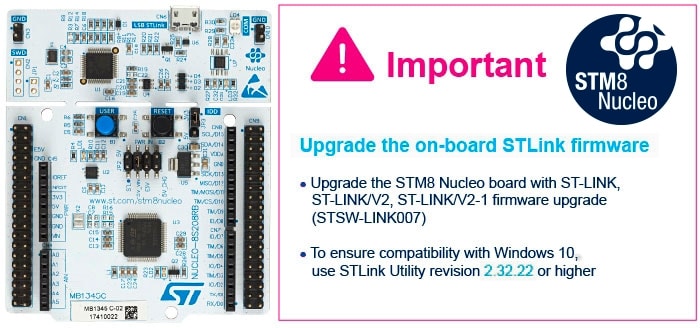 The STM8 Nucleo-64 boards do not require any separate probe as they integrate the ST-LINK/V2-1 debugger and programmer.