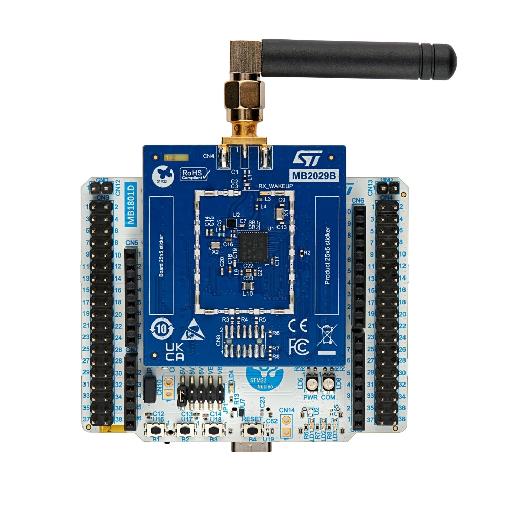 The STM32WL3x Nucleo-64 boards based on the MB1801 mezzanine board and MB2029 MCU RF board (NUCLEO-WL33CC1 and NUCLEO-WL33CC2 order codes) embed the STM32WL33CCV6 sub-GHz application processor. This high‑performance and low‑power application processor can operate in 433, 868, and 915 MHz bands.