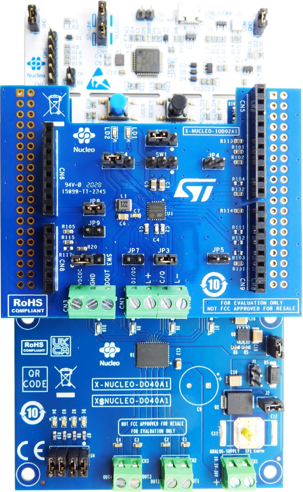 The P-NUCLEO-IOD5A1 is an STM32 Nucleo pack composed of the X-NUCLEO-IOD02A1 and X-NUCLEO-DO40A1 expansion boards stacked on the NUCLEO-G071RB development board.