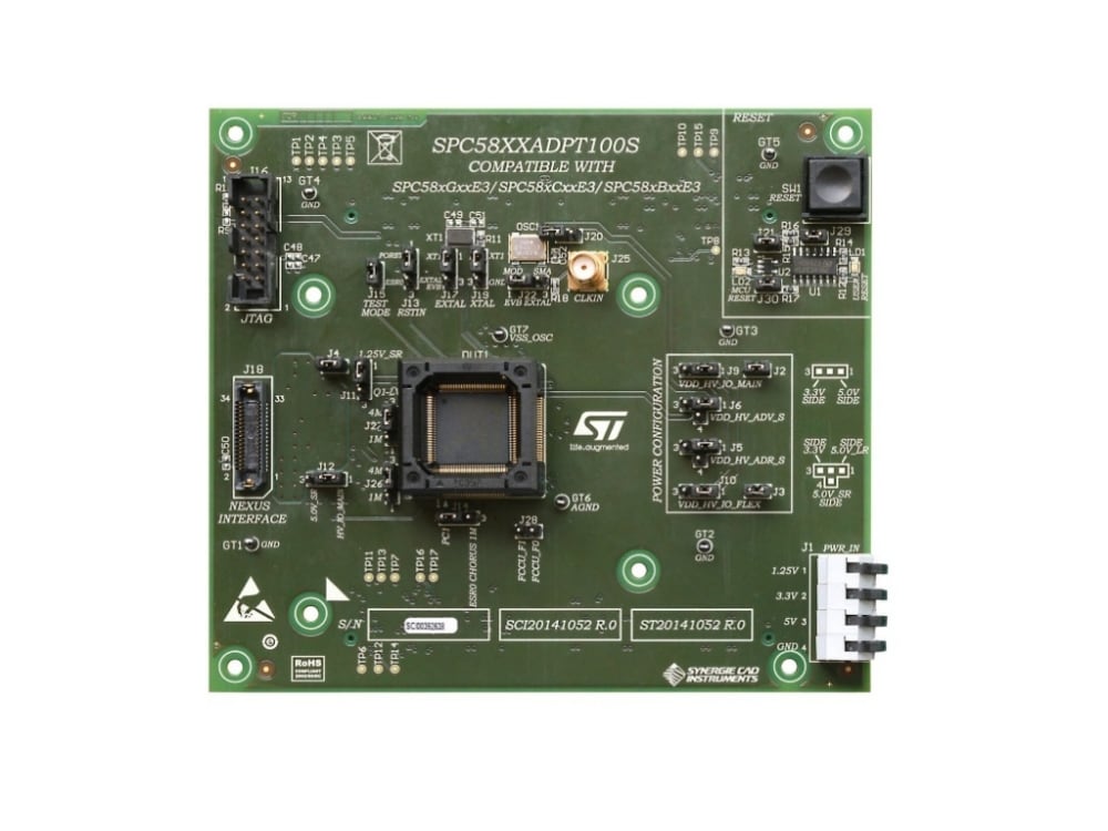 The SPC58XXADPT100S Premium Evaluation Boards System supports the 32-bit SPC58xGxxE3, SPC58xCxxE3, SPC584BxxE3 and SPC582BxxE3 STMicroelectronics' automotive microcontrollers.