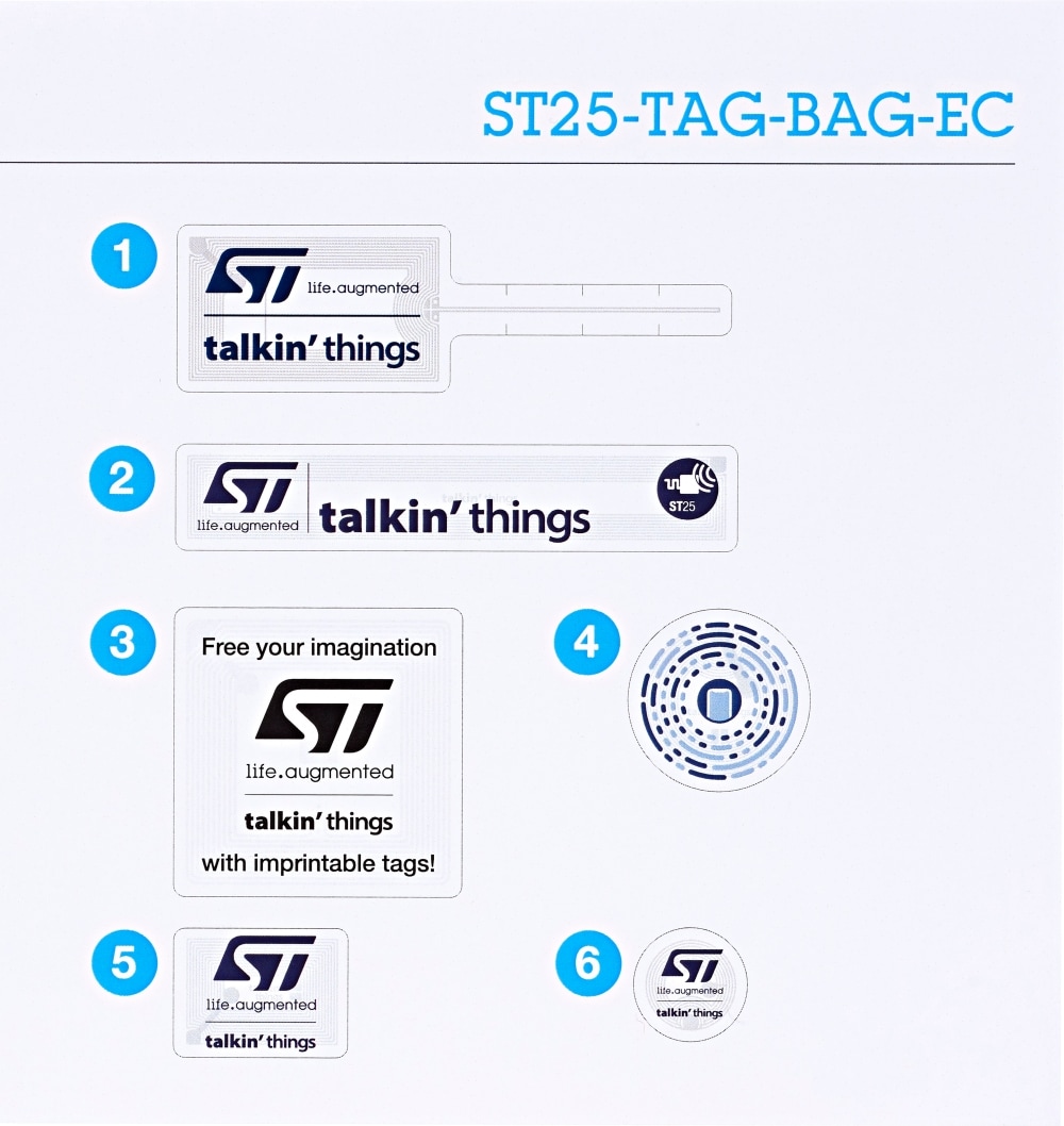 The ST25-TAG-BAG-EC is a ready-to-use set, containing tags based on NFC Forum Type 5 (ST25TV512C and ST25TV02KC) and NFC Forum Type 2 (ST25TN512 and ST25TN01K) tag ICs. These ICs are combined with antennas of different size and material, with advanced designs (like tamper detect) to address different applications.