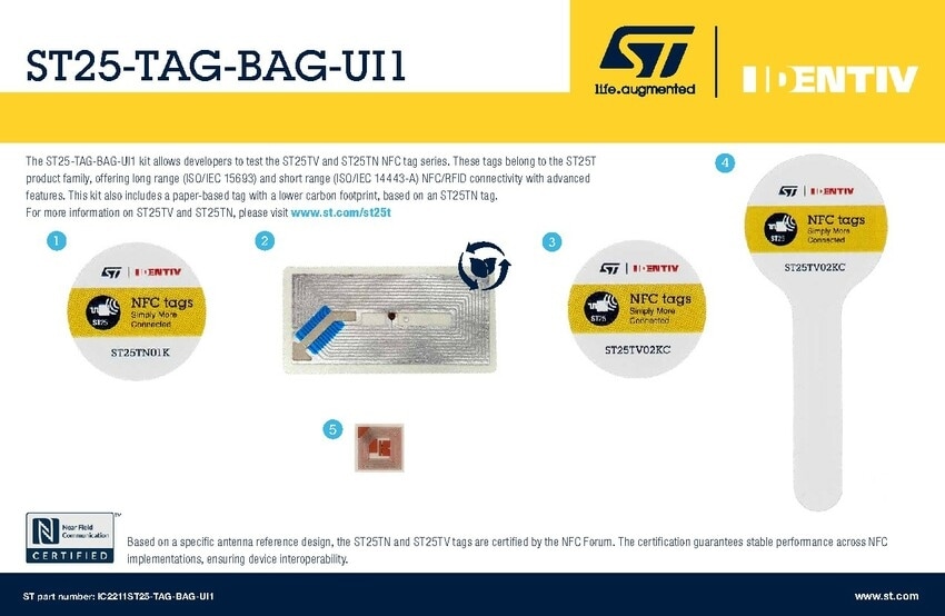 The ST25-TAG-BAG-UI1 is a ready-to-use tag set, containing tags based on NFC Forum Type 5 (ST25TV02KC) and NFC Forum Type 2 (ST25TN01K) tag ICs. These ICs are combined with antennas of different size and material, with advanced designs (like tamper detect), to address different applications.
