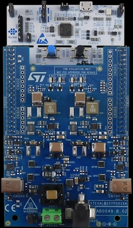 The STEVAL-2STPD01 is an evaluation kit composed of an expansion board containing two Type-C ports and integrating two STPD01PUR programmable buck converters for USB Power Delivery, and the NUCLEO-G071RB STM32 Nucleo-64 development board.