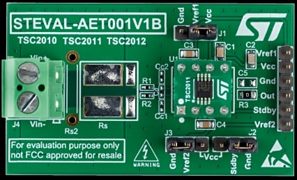 The STEVAL-AETKT1V2 evaluation kit represents a bidirectional current sense amplifier with high side or low side sense resistor. The kit consists of a main board and individual daughter boards for the TSC2011, TSC2010 and TSC2012 high voltage, bidirectional, current sense amplifier ICs, which provide a a fixed gain of 60, 20 or 100, respectively.