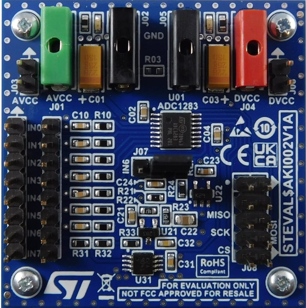 The STEVAL-AKI002V1 evaluation board allows the user to evaluate the conversion performance of the ADC1283 8-channel analog-to-digital converter designed for 50 to 200 ksps conversion.