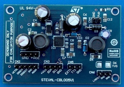 The STEVAL-CBL005V1 LNB power supply demonstration board implements a DC-DC converter based on the LNBH23 device. The LNBH23 is an LNB supply and control IC with step-up and an I2C interface. It is used to power an LNB on a dish antenna for reception of satellite TV signals.
