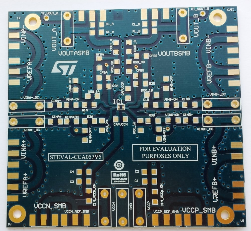 The STEVAL-CCA057V5 evaluation board is designed to help customers quickly prototype new dual op amp circuits in a DFN8 package and reduce design time.