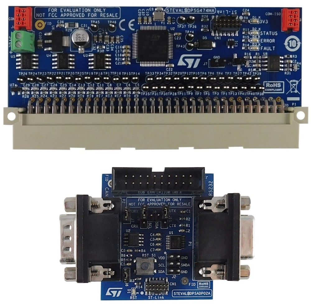 The STEVAL-DPSG474 is a digital power supply control kit. It consists of a main board, based on the STM32G474RE microcontroller from the STM32G4 family, and an adapter board, which provides different communication interfaces and allows programming the microcontroller through a standard 20-pin JTAG connector.