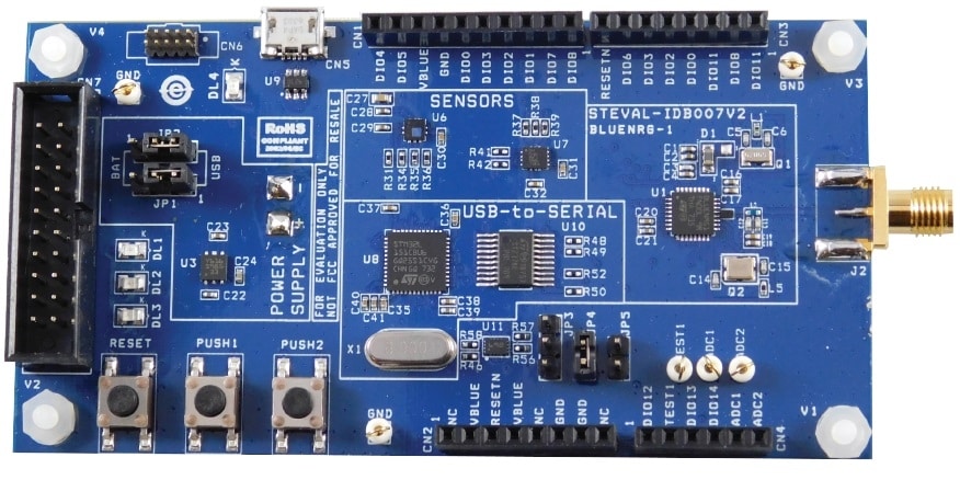 The STEVAL-IDB007V2 evaluation platform is based on the BlueNRG-1, low power Bluetooth® smart system on chip, compliant with the Bluetooth® specification and supporting master, slave and simultaneous master-and-slave roles.