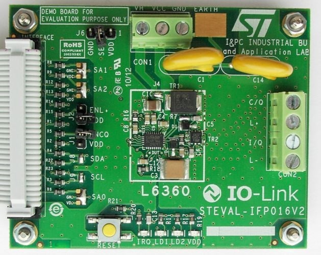 The STEVAL-IFP016V2 IO-Link communication master transceiver demonstration board is based on the L6360, monolithic IO-Link master port. A modular and customizable application that interfaces externally with the microcontroller. The purpose of the board is to demonstrate the capability of the L6360 monolithic IO-Link master, as communication transceiver for multiple I/Os.