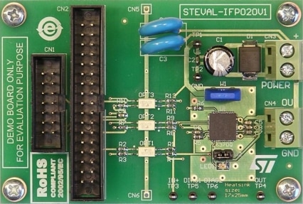 The STEVAL-IFP020V1 demonstration board is based on the L6370Q, a single-channel high-side driver chip intended for driving resistive, inductive or capacitive loads in an industrial environment. It provides an embedded fast demagnetization feature for inductive load switch-off.