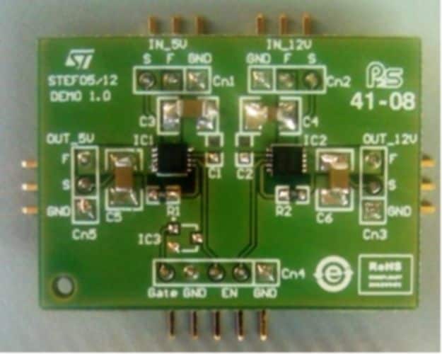 The STEVAL-IFP021V1 demonstration board is based on the STEF05 and STEF12 electronic fuses (E-Fuses).