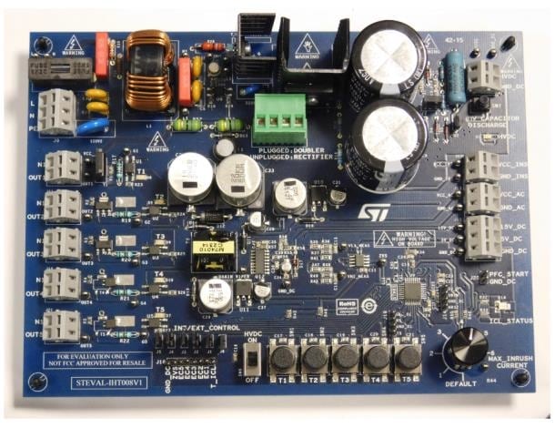 The STEVAL-IHT008V1 evaluation board limits the inrush current charging a DC bus capacitor so that it is compliant with the IEC 61000-3-3 standard. This inrush current is based on a soft-start procedure for the rectifier bridge achieved with a T1635T-8FP Triac added in series with the mains line, which is controlled by the STM8S103K3 microcontroller through progressive phase-control during the startup phase.