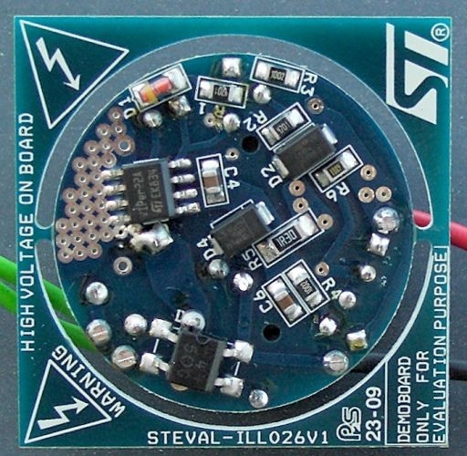 This demonstration board is designed for 350 mA LEDs and is capable of driving three 1 W LEDs in series with high-precision constant current (± 5% tolerance). The design is based on the VIPer22AE, which combines a dedicated current mode PWM controller with a high voltage power MOSFET on the same silicon chip.