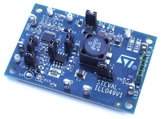 The STEVAL-ILL049V1 is an adapter board designed to provide an application example of compact LED driver using the new LED6001 chip. The board is equipped with a single-channel, constant-current LED driver operating with both boost and SEPIC topologies. The brightness of the LED string connected to its output can be controlled through a PWM signal (0%-100% dimming) or a control voltage (10:1 analog dimming). Open LED, feedback disconnection, LED over-current and output-to-ground short-circuit (SEPIC only) faults are detected and managed.