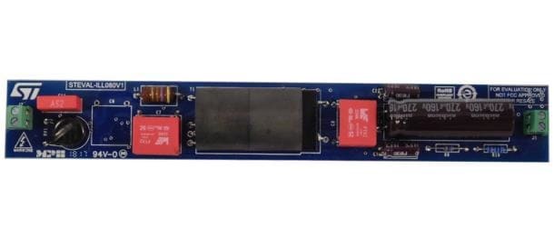 The STEVAL-ILL080V1 provides a 200 mA, ripple-free output current to supply a single LED string between 75 and 93 V.