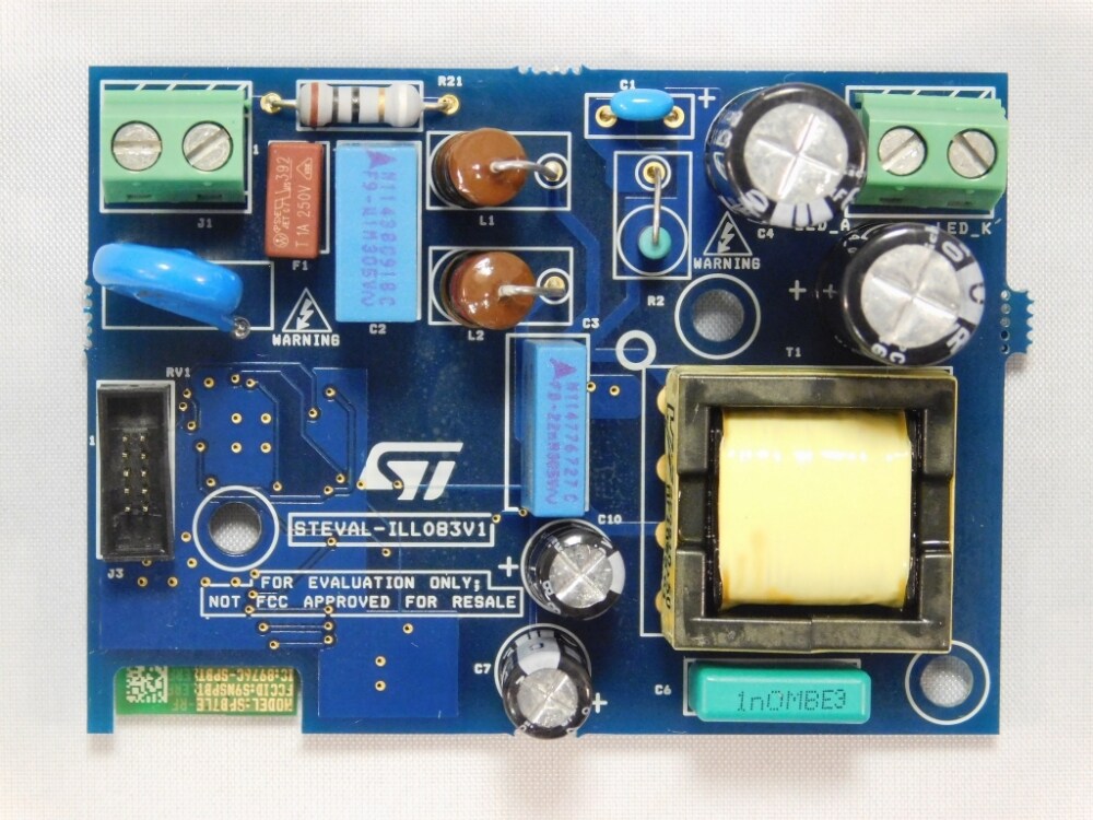 The STEVAL-ILL083V1 evaluation board is an offline LED driver based on HVLED815PF and SPBTLE-RF very low power module for Bluetooth Smart v4.1 connectivity. The interfacing between the HVLED815PF and the SPBTLE-RF is managed by a STM32L0. The microcontroller and the connectivity module are supplied by the LED driver through the primary side auxiliary winding.