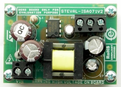 The STEVAL-ISA071V2 demonstration board is a non-insulated SMPS capable of delivering a 4 W output over a wide input voltage range and is designed for a mains application requiring -5 V and +7 V, referred to neutral.