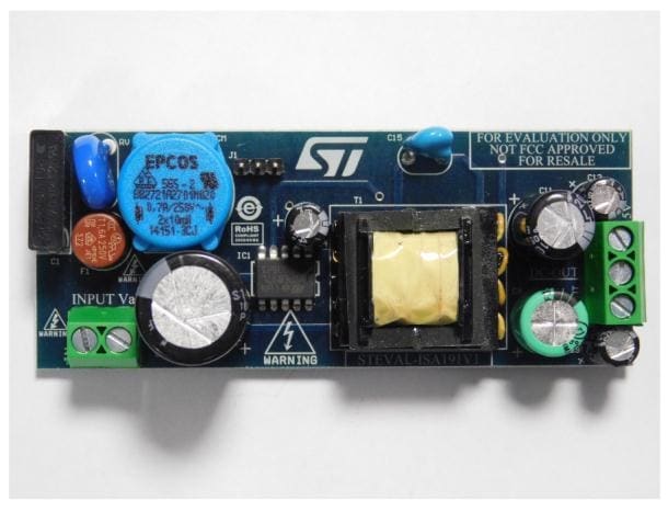 The evaluation board features a small size, minimal BOM, high efficiency and low standby consumption. Extremely low consumption under no-load conditions is ensured thanks to burst mode operation that reduces the average switching frequency and minimizes all frequency related losses.