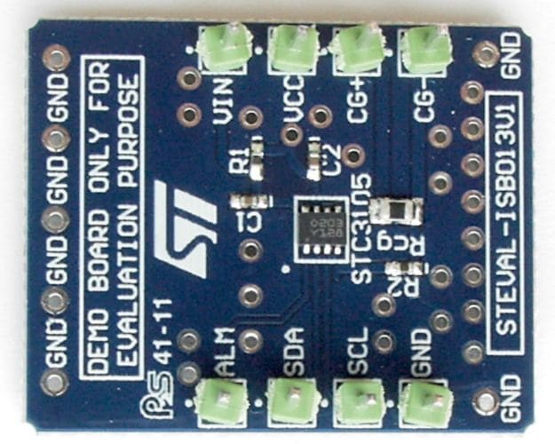 The STEVAL-ISB013V1 is a demonstration board based on the STC3105 battery monitor IC. The application monitors the voltage and current of a battery and includes a Coulomb counter to keep track of the charge/discharge status.
