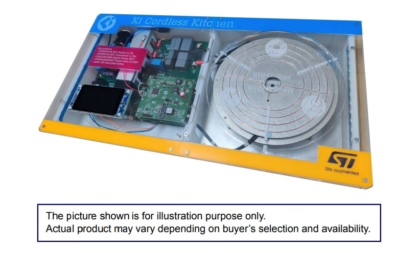 The STEVAL-KITXCB is an evaluation kit for Ki cordless kitchen transmitter. The evaluation kit includes power inverter board, auxiliary power supply board, NFC board, inverter microcontroller board, power coil and NFC coil, and GUI display board. Thanks to the modular design approach, it becomes easier for the user to test and debug the various sections involved.