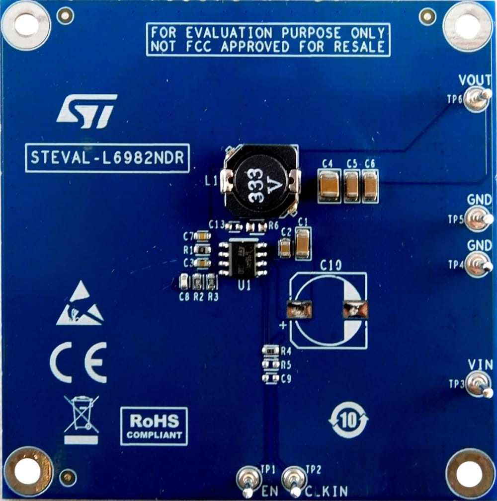 The STEVAL-L6982NDR evaluation board is based on the L6982NDR synchronous monolithic step-down regulator capable of delivering up to 2 A DC to the load.