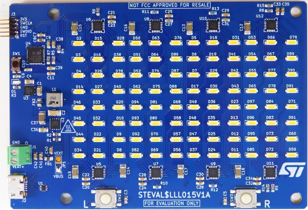 The STEVAL-LLL015V1 is a board with 96 individually driven LEDs controlled by eight LED1202 LED drivers. The drivers are connected to the same I2C bus and share a master clock for common sequence timing. Each LED can be programmed to perform an individual 8-step pattern sequence (single shot or repeated). The panel is configured using the STSW-LED1202GUI, and the user can program several light effects using a basic language interpreted by the firmware. The scripts are written in a dedicated area of the GUI and can be debugged before downloading them onto the board. Once downloaded, the board can execute the scripts without requiring the use of PC software.
