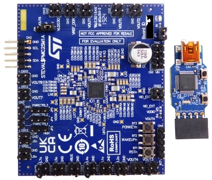 The kit includes a USB dongle, which provides I²C access to the configuration registers of the STPMIC25 device, where voltage settings, power sequences, protection thresholds and other parameters can be set.