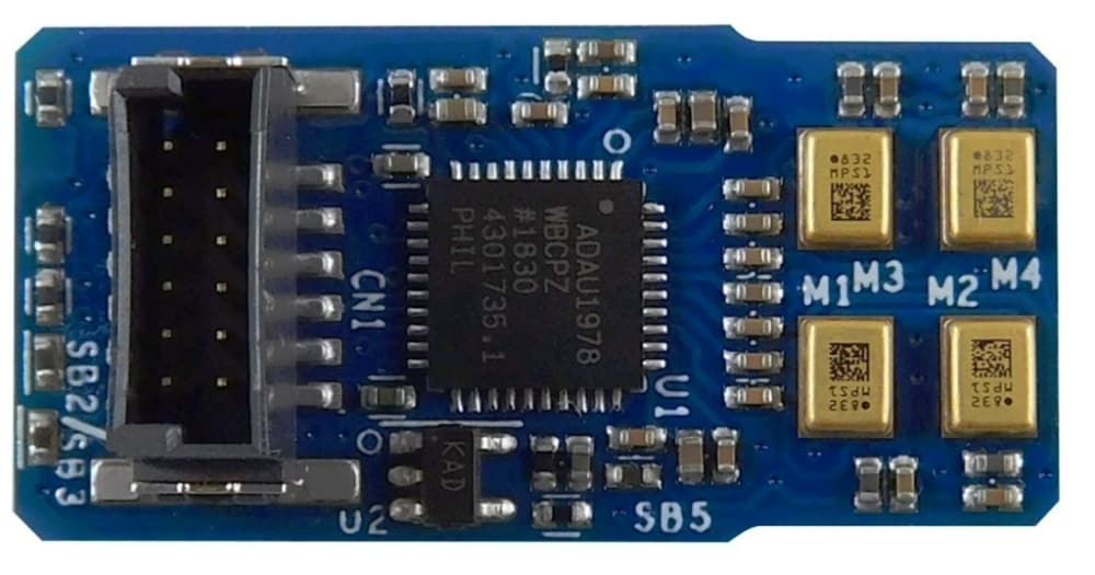 - 4x MP23ABS1 high-performance, single-ended, analog, bottom-port MEMS microphones