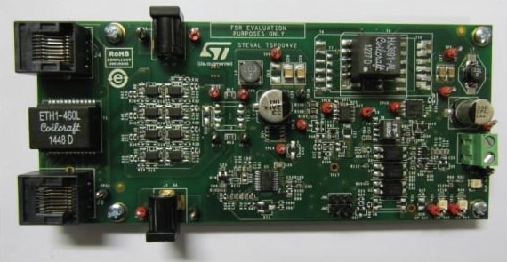 The STEVAL-TSP004V2 is a reference design for a PoE+, high-efficiency, 5 V/4 A flyback converter based on the PM8803 PoE controller.