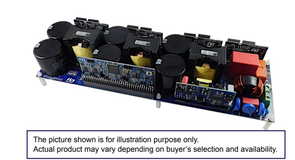 The STEVAL-TTPPFC01 evaluation kit is a modular solution, which consists of: a power board, which contains all the main passive devices and all the daughter boards plug connectors; a control board, which embeds the STM32G474QE microcontroller; an auxiliary power supply board, which generates all the voltages for driving, sensing, MCU, etc.; three high-frequency half-bridge boards; a low-frequency half-bridge board.
