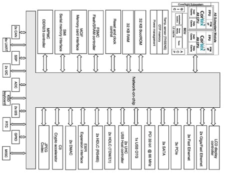 - Multi-port controller (MPMC) for external DDR2-800/DDR3-1066 with 16/32 bits datapath, up to 1GB addressable with ECC option for SEC/DED