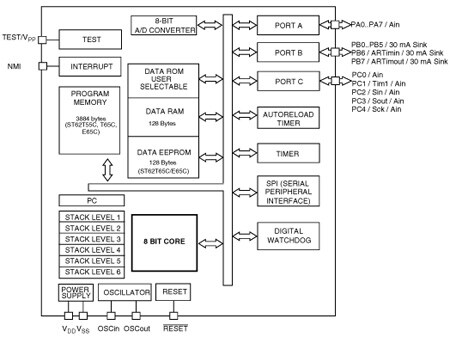 The ST62T55C, ST62T65C and ST62E65C devices are low cost members of the ST62xx 8-bit HCMOS family of microcontrollers, which is targeted at low to medium complexity applications. All ST62xx devices are based on a building block approach: a common core is surrounded by a number of on-chip peripherals.