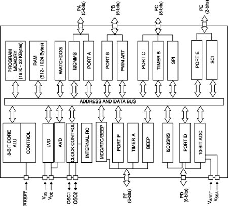 - 16-bit timer A with: 1 input capture, 1 output compare, external clock input, PWM and pulse generator modes