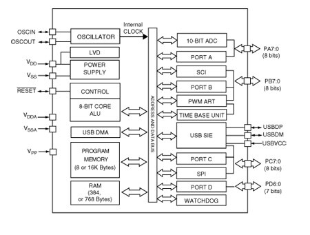 8K or 16K Program memory (ROM or Dual voltage FLASH) with read-write protection In-Application and In-Circuit Programming for FLASH versions 384 to 768 bytes RAM (128-byte stack) - USB (Universal Serial Bus) Interface