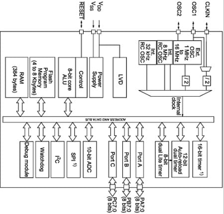• Clock, Reset and Supply ManagementLow voltage supervisor (LVD) for safe power-on/offClock sources: Internal trimmable 8 MHz RC oscillator, auto wakeup internal low power - low frequency oscillator, crystal/ceramic resonator or external clockExternal reset source and watchdog resetFive power saving modes: Halt, Active-Halt, Auto Wakeup from Halt, Wait and Slow