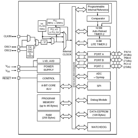 The ST7LITE1xB is a member of the ST7 microcontroller family. All ST7 devices are based on a common industry-standard 8-bit core, featuring an enhanced instruction set.